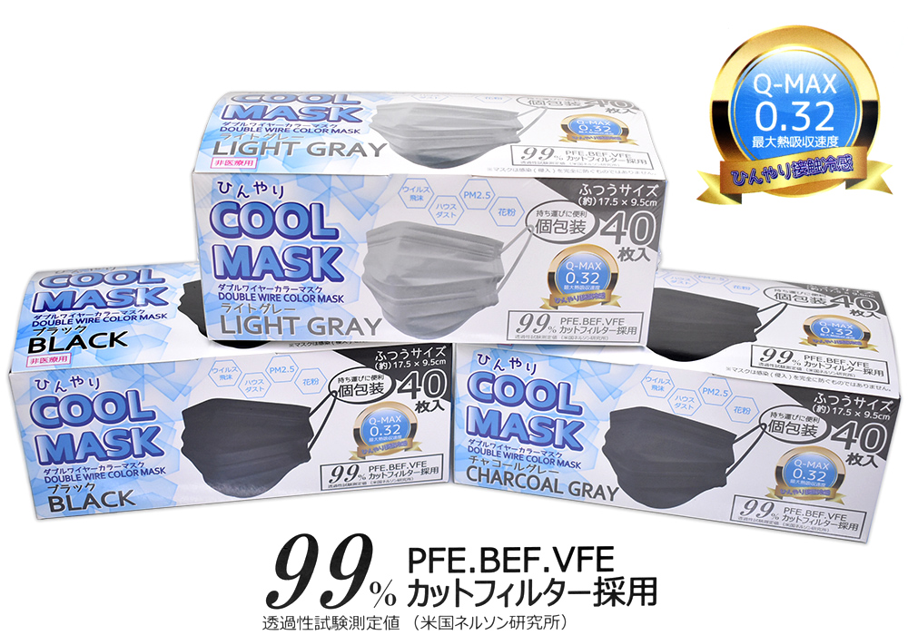 ふつうサイズ ダブルワイヤーカラーマスク冷感不織布タイプ40枚入※ダンボール入りケース販売をご希望の場合はお問い合わせください。1ケース48個入りカラーアソート(LG18+CG10+BK20)。ひんやり COOL MASK (ひんやりクールマスク)「 ダブルワイヤーカラーマスク 」PFE試験済、BFE試験済、VFE試験済。 不織布 3層構造。ウイルス飛沫をブロックする高性能フィルター採用。*BFE(Bacterial Filtration Efficiency)バクテリア飛沫捕集(ろ過)効率試験済み。*VFE(Viral Filtration Efficiency)ウィルス飛沫捕集(ろ過)効率試験済み。*PFE(Particle Filtration Efficiency)微粒子捕集(ろ過)効率試験済み。透過性試験測定値 (米国ネルソン研究所) 空気中の細菌(バクテリア)や試験用のウイルス、また約0.1μmの微粒子が、マスクなどの不織布を通して沪過される程度を確認する試験です。◆ 接触冷感とは? 手が触れたときに「冷たく」感じるか、「暖かく」感じるか、肌から布への熱の移動量によって感じ方が異なります。 このとき感じる熱移動(冷感)を評価する指標に接触冷感評価値Q-max(キューマックス)があります。 試験法規程の温度差ΔTの熱板とセンサーを重ね、そのセンサーを試験片に接触させたときの瞬間的な熱の移動量(試料の熱吸収変化量)の最大値を測定します。数値が大きいほど、触れた時に冷たく感じることを表します。◆ 便利で衛生的な個包装! 使いやすい、使い切りタイプ。《 用途 》 花粉、PM2.5、ハウスダスト、黄砂対策などに。●ダブルワイヤーで口もとスペース!リップワイヤー入りなので口元に空間ができ、呼吸が楽にできます。●ノーズフィッター入りフィット機能マスクのプリーツを伸ばし、ノーズフィッターを押さえて鼻のラインにフィット。マスクのフィルター効果を高めます。●ポリプロピレン不織布 (Melt-Blown33%、Non-woven67%)高性能フィルタ入り3層構造で、花粉やホコリ、PM2.5、ウィルス飛沫等の侵入をブロックします。 ※マスクは感染(侵入)を完全に防ぐものではありません。●やわらか耳ゴム耳かけには、耳にやさしい平ゴムを使用しています。■ 無彩色カラー不織布使用。裏面は無着色ホワイトの生地ですが、重ね合わせによりブラックとチャコールグレーではライトグレー系の色味に見えます。裏面の上下部分は生地折り返しのため表面と同色です。箱サイズ:約W20.4cm×D10.3cm×H8.5cm執行標準(Standard):GB/T32610-2016 準拠 Daily protective mask ※医療用ではありません。JAN (Light gray)4571286434095 (Charcoal gray)4571286434101 (Black)4571286434118※配色・デザインは改良のため予告なく変更される場合があります。#eふとん屋さん#いいふとん屋さん#やまだ布団店#山田ふとん店#布団店#ふとん屋#ふとん屋さん#寝具#布団#良品#特価#松阪#やまだ#個包装クールマスク、ダブルワイヤー冷感不織布カラーマスク
