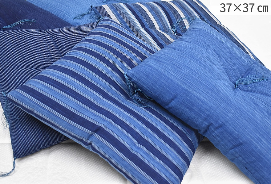 伝統的な「松阪もめん」の生地で作った座布団です。正藍染の糸で織った木綿生地で、人気の縞柄や藍無地をラインナップ。